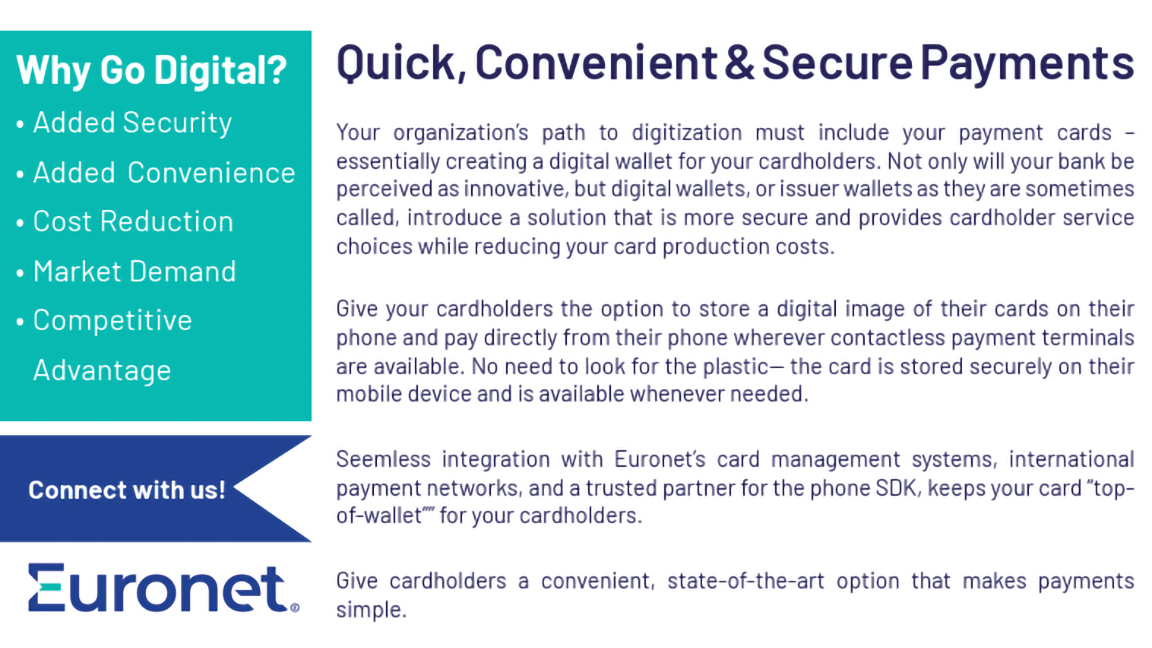 In a world where convenience and security are paramount, your path to digital transformation must include digitized payment cards. Euronet’s Digital Wallet Solution empowers financial institutions to give their customers what they now expect—frictionless, secure, contactless payments right from their mobile devices.