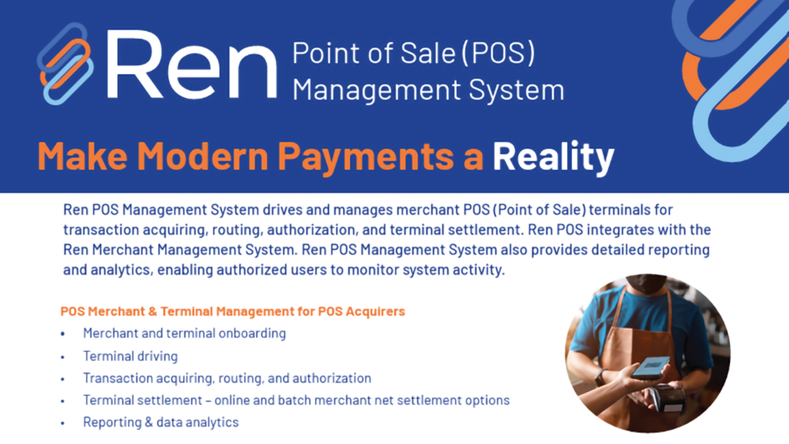 The Ren POS Management System empowers financial institutions, acquirers, and processors to centrally manage merchant point-of-sale (POS) devices—driving transactions, authorizations, routing, and settlements with high efficiency and control.