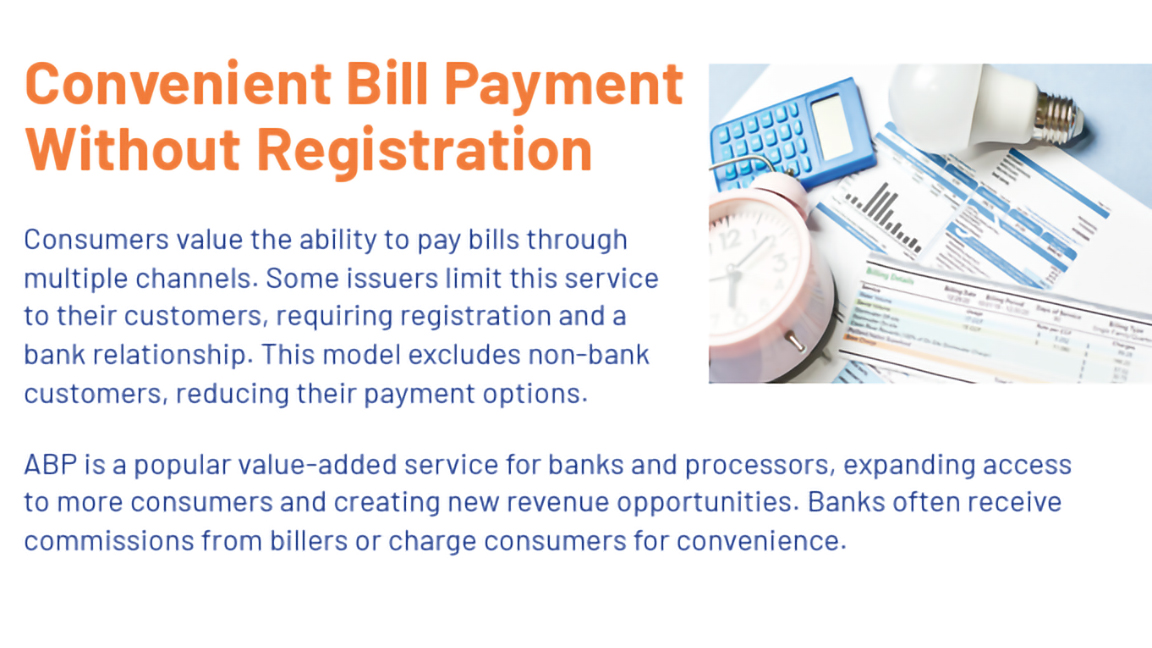 ABP is a powerful, value-added service that enables banks, acquirers, and processors to offer convenient bill payment through multiple channels—without requiring consumer registration or a banking relationship. This opens the door to a broader market and creates new revenue streams through biller commissions and consumer convenience fees.