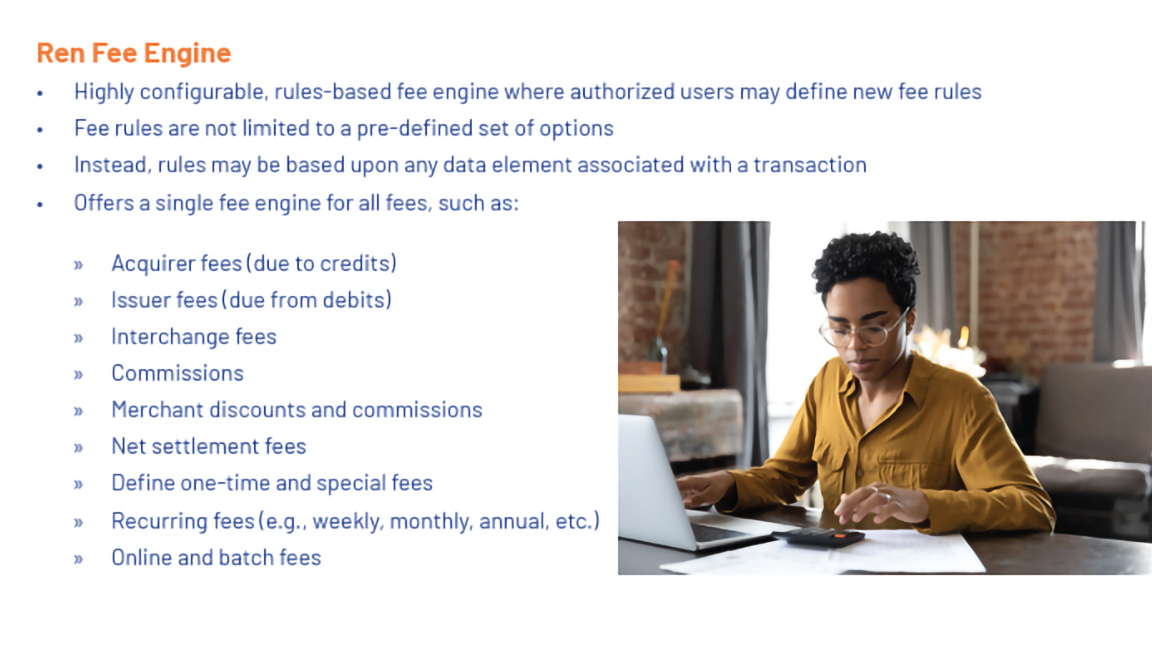 Built on a flexible, rules-based architecture, Ren enables banks, processors, and acquirers to define and manage any type of fee—based on any data element within a transaction—with zero code changes required.