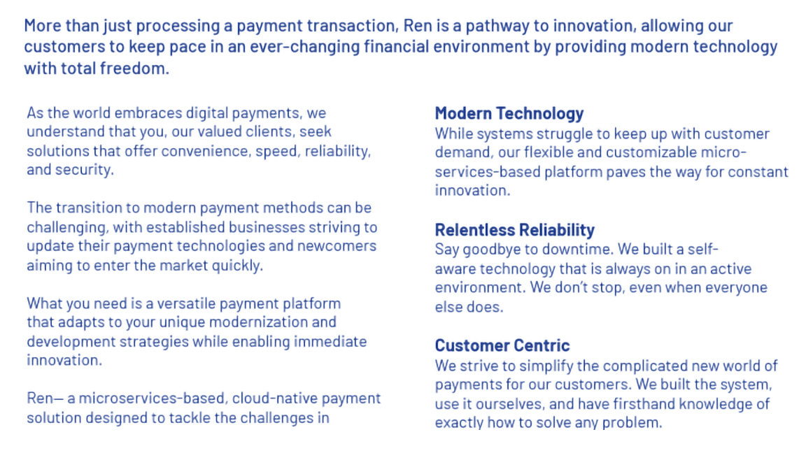 Ren is a modern, microservices-based, cloud-native platform designed to empower financial institutions, fintechs, and commerce providers to lead with confidence.